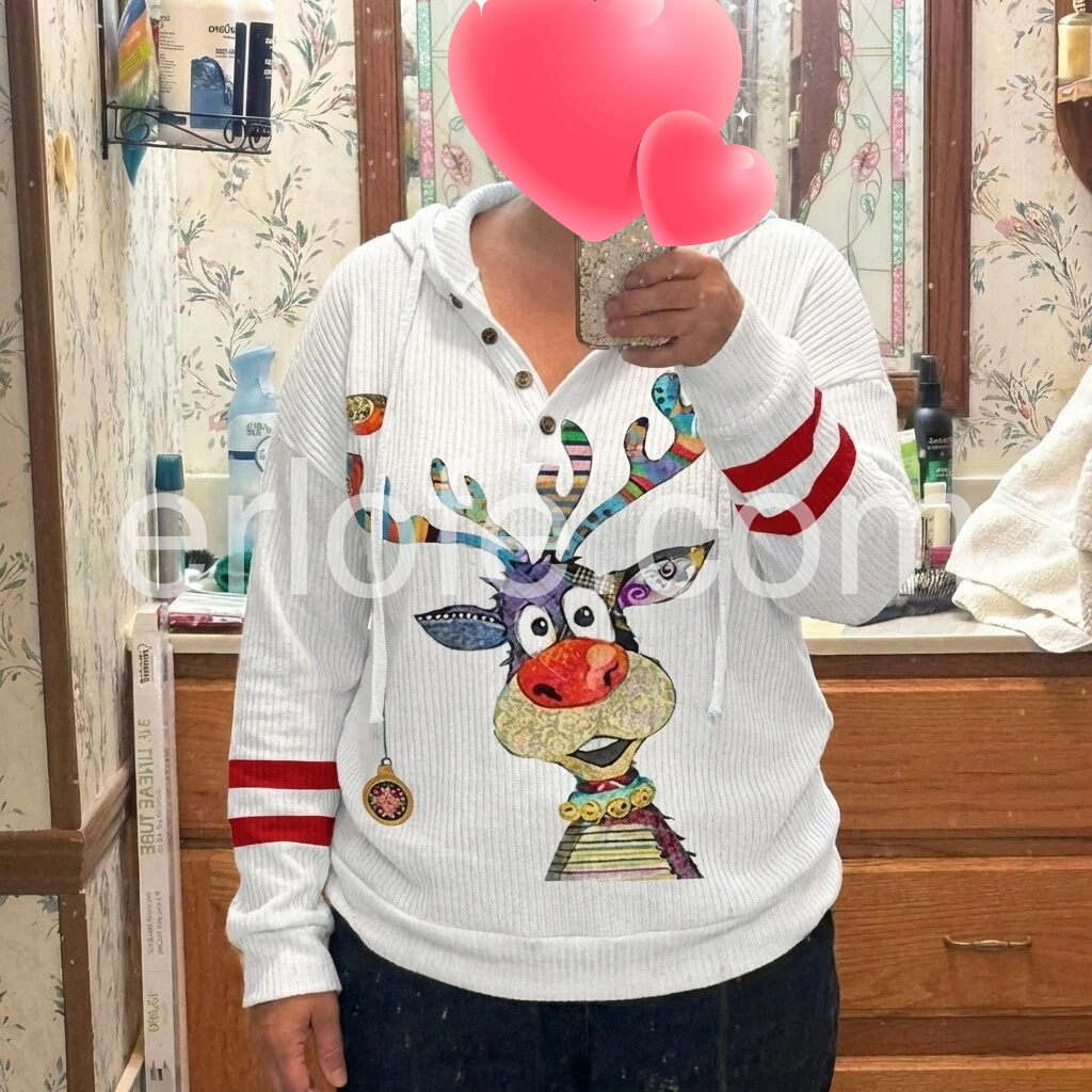 Bring in the winter season with this holiday-ready reindeer top. A white cozy ribbed top with red stripes and colorful reindeer print make this hoodie a cheerful complement to your day or night with its relaxed vibe. A plunging v-neck and buttons on the front give it the perfect amount of detail and chic fit.